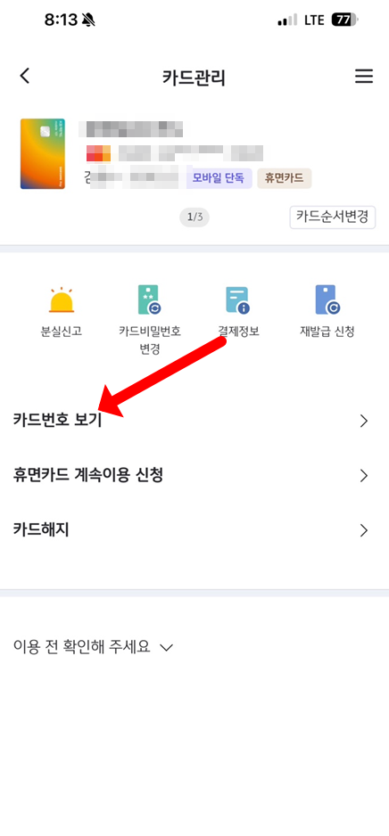 3. 카드 관리에서 카드번호 보기를 선택합니다.