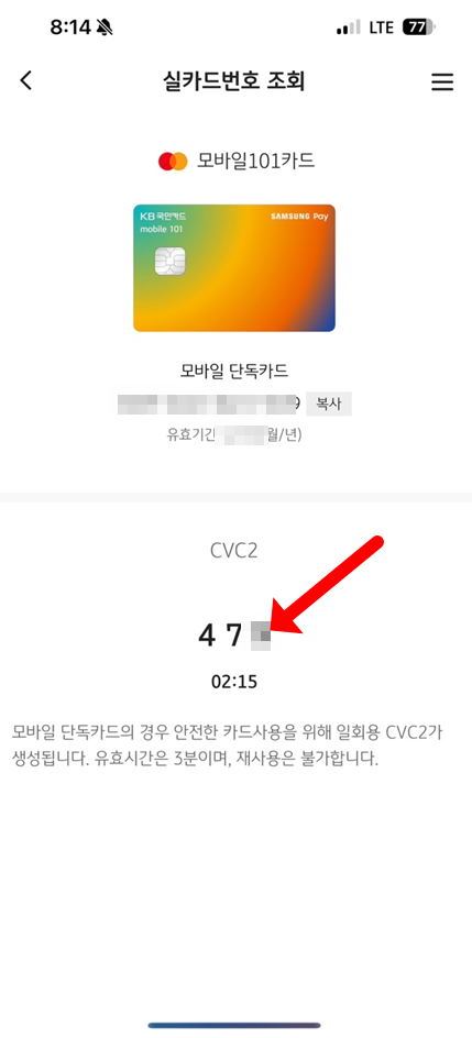 모바일 단독카드의 경우 일회용 CVC2가 생성이 되며 유효기간은 3분으로 재사용은 불가능합니다.