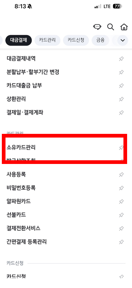 2. 메뉴를 누르고 카드관리 소유카드관리를 클릭합니다.